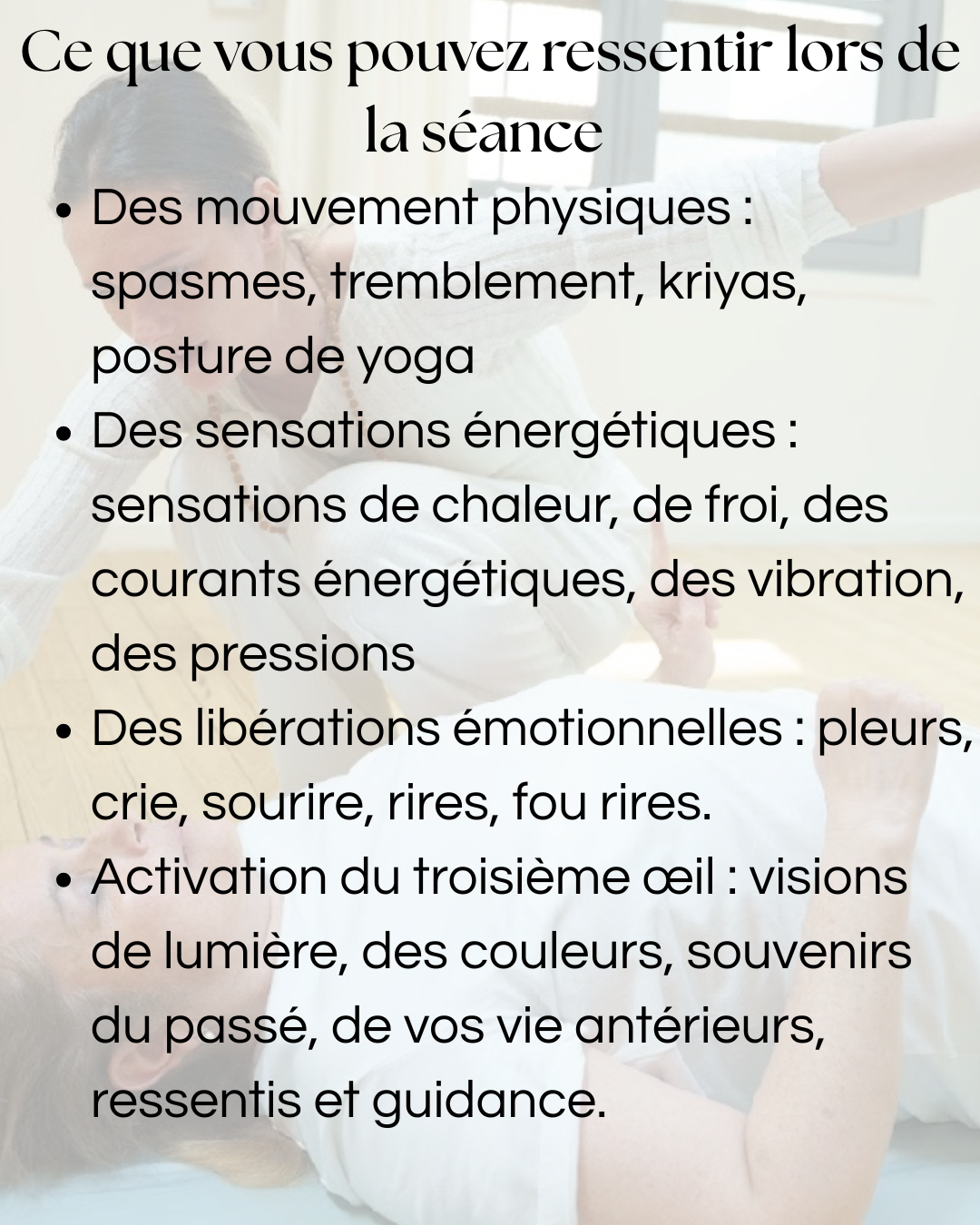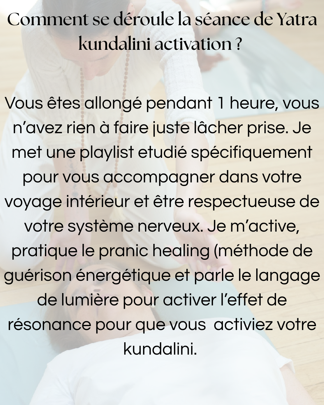 Je passe part la pour vous partager mon expérience une séance de 2h individuel que j'ai découvert. Cela m'a fait énormément de bien. J'ai pue me déconnecter pendant cette instant. Je me suis senti tellement mieux part la suite une sensation de légèreté. Je vous recommande de tester cette expérience avec manon yatrakundaliniactivation